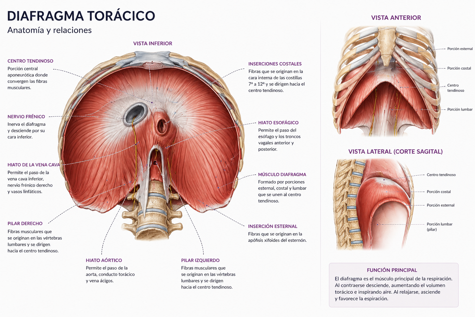 El diafragma es una estructura central en la regulación de presiones del cuerpo. No solo participa en la entrada y salida de aire, sino que también actúa como un punto de conexión entre el tórax y el abdomen. Además, sus inserciones se localizan directamente en las costillas, especialmente entre la séptima y la décima.