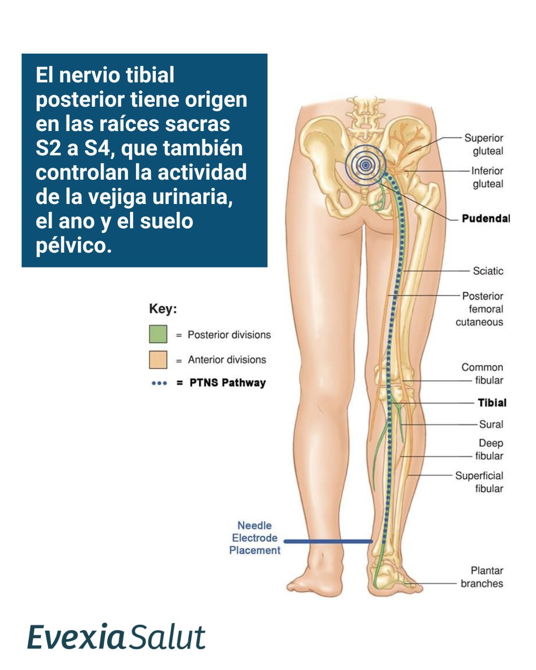 La PTNS consiste en aplicar estimulación eléctrica controlada al nervio tibial posterior, ubicado en la cara interna del tobillo (posterior al maléolo medial). Este nervio nace de las mismas raíces sacras (S2, S3 y S4) que inervan: